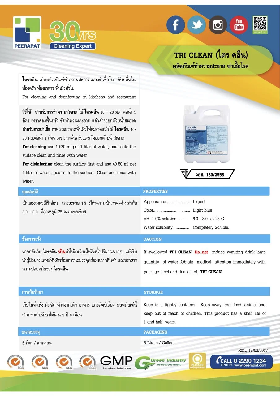 ไตรคลีน เป็นผลิตภัณฑ์ทำความสะอาดและฆ่าเชื้อโรค ดับกลิ่นในห้องครัว ห้องอาหาร พื้นผิวทั่วไป